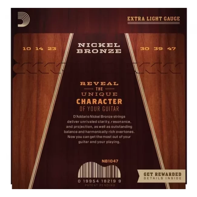 El conjunto de cuerdas acústicas premium sin recubrimiento de D'Addario que proporcionan un sonido nítido y claro para acentuar el tono único de su guitarra. NB1047 es un compromiso cómodo para los guitarristas que desean la profundidad y la proyección de las cuerdas inferiores de calibre ligero, pero una tensión ligeramente menor en las cuerdas altas para hacer bends fácilmente.