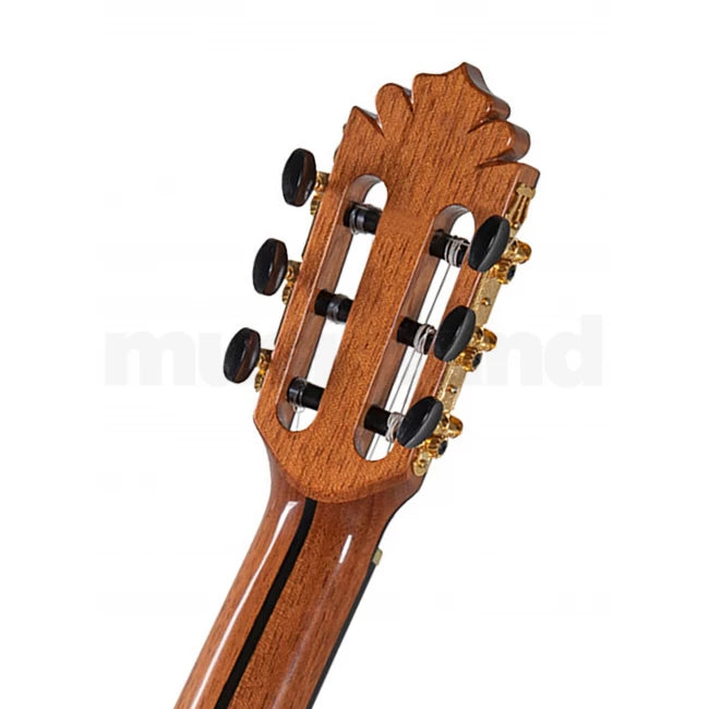 Además del uso de maderas macizas, la construcción original del mástil español garantiza una respuesta rápida, un desarrollo óptimo del sonido, un sustain duradero y la máxima estabilidad. En esta clase real de construcción de guitarras, el mástil de una sola pieza se extiende dentro del cuerpo y está directamente conectado a los aros, el fondo y la tapa. La madera de cedro utilizada para ello es especialmente ligera y optimiza el equilibrio de la guitarra.
